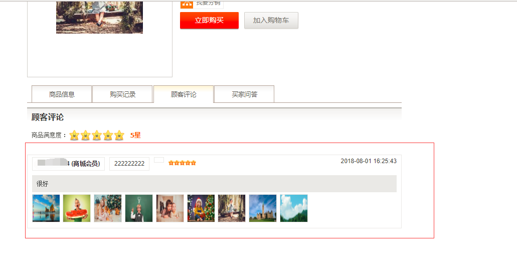1. 以pc版为例,在前端“会员中心”-“待评价”中点击需要评价的产品,在文本框的下方会有晒图功能,传入图片后点击“评价”即可(注:仅支持9张图片),在后台“产品评价”中,将该评论点击显示后,在前台中该产品评论中会显示该评论,如图所示: